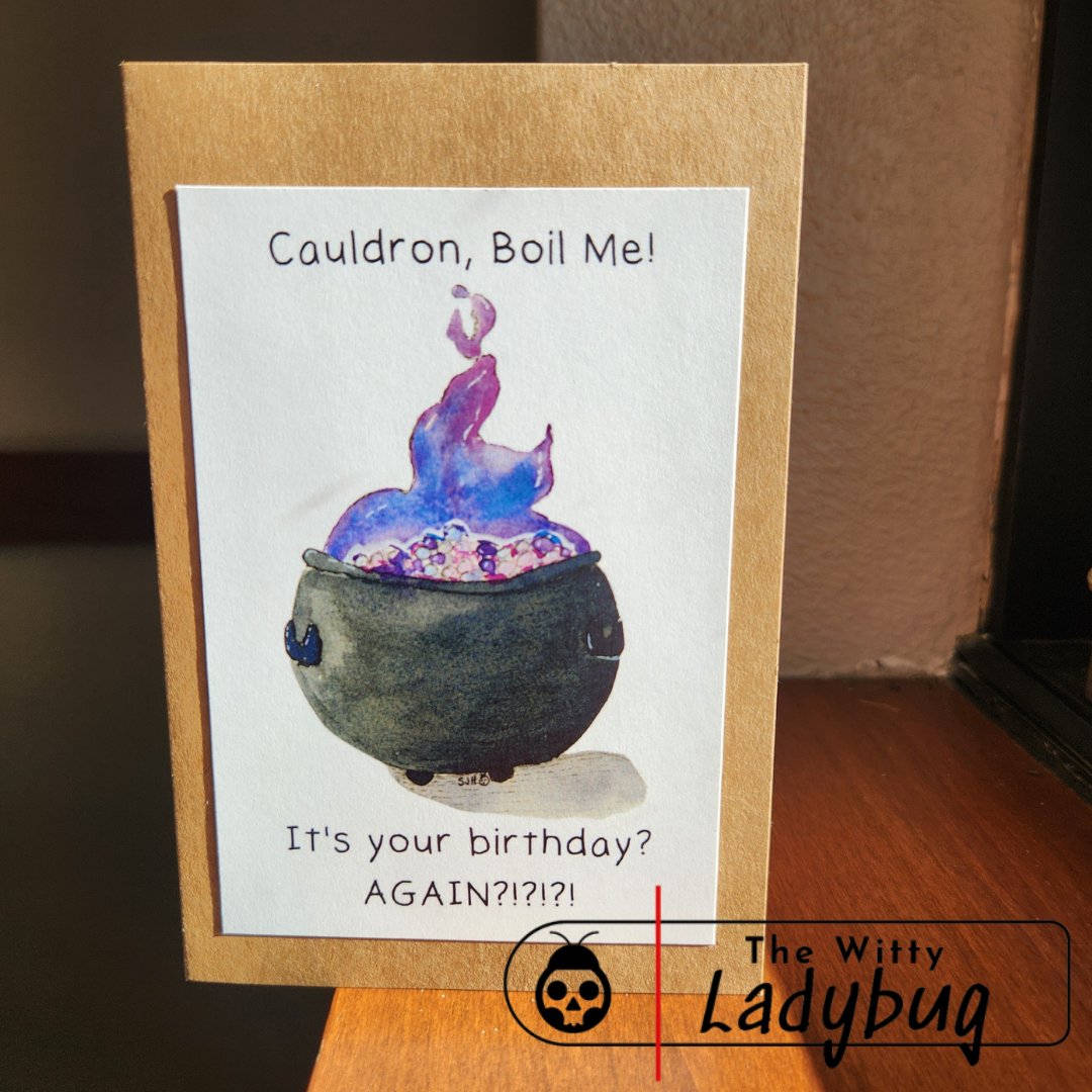 Double, double, sass and trouble: this handmade birthday card is bubbling over with dark humor. Featuring the phrase “Cauldron, boil me. It’s your birthday? Again?” it’s perfect for spooky season celebrations, witchy besties, or anyone who loves a little sarcasm with their cake.